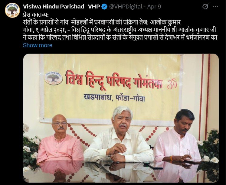गोवा में विश्व हिंदू परिषद (वीएचपी) के अंतर्राष्ट्रीय अध्यक्ष एडवोकेट आलोक कुमार ने कहा, विभिन्न संप्रदायों के संतों के सामूहिक प्रयासों के कारण, देश भर में धार्मिक जागरूकता का व्यापक माहौल बन रहा है, और “घर वापसी” (धर्मांतरित व्यक्तियों की हिंदू धर्म में वापसी) की प्रक्रिया देश भर के गांवों में तेजी से आगे बढ़ रही है।